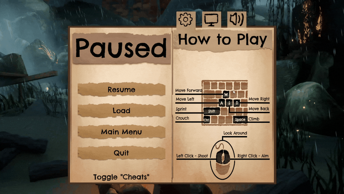 A pause/settings menu made for a senior game project. Design by me- tech by Ridley Liu - art by Chloe Ng